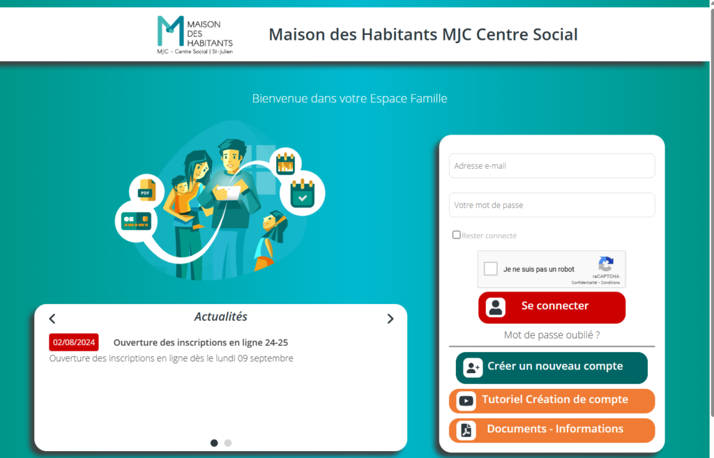 Vous pouvez, grâce au lien ci-dessous, créer votre Espace Famille, qui vous permettra par la suite de vous inscrire, de manière autonome, à vos Actions Famille favorites (Activités Régulières, ateliers, animations, sorties pendant les vacances…).